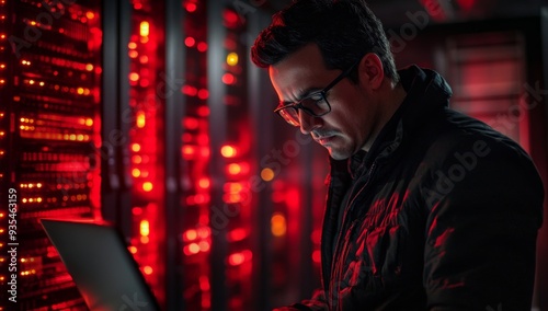 Man Working on Laptop in Data Center with Red Server Lights - Cybersecurity and Technology Concept
