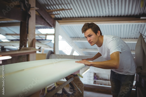 Man working on surfboard in workshop