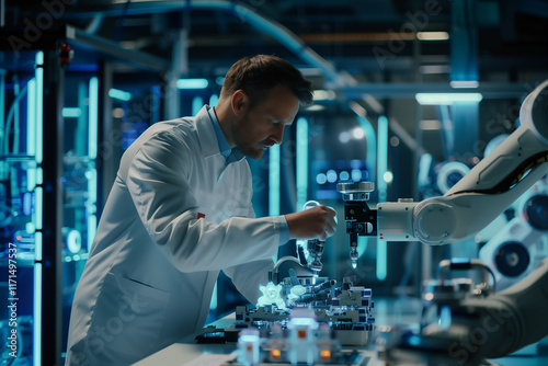 Manager technical Industrial engineer working and control robotics, Smart factory and production line. Futuristic factory and technology concept