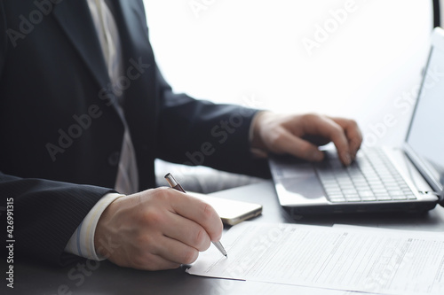 Manager works at a laptop in the office. Businessman makes an online transaction. Trading on the exchange via the Internet.