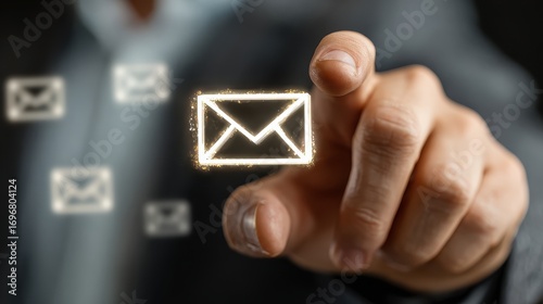 Manages digital inbox on computer keyboard with glowing envelope icons sending and receiving messages for communications, digital mail, and technology
