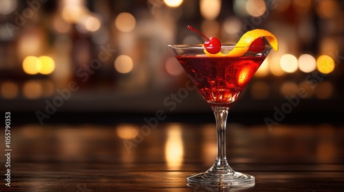 Manhattan Cocktail Garnished with Orange Twist and Cherry in a Comfortable Bar Setting