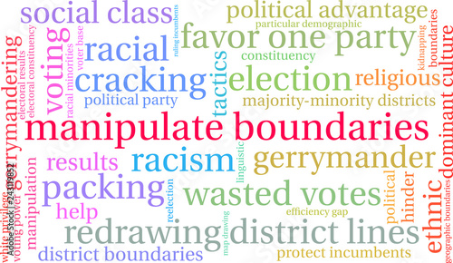 Manipulate Boundaries with Gerrymandering Word Cloud on a white background.