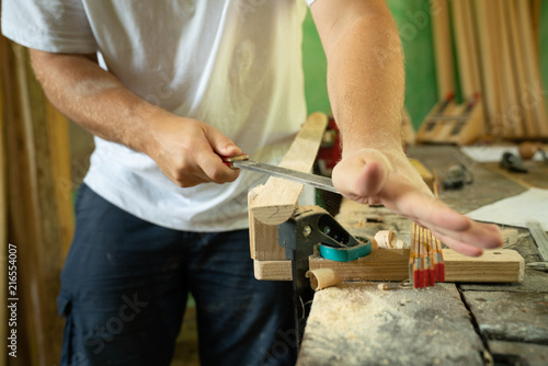 Mann arbeitet mit einer Raspel auf Holzwerkstück in einer Werkstatt
