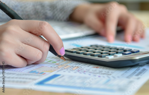 manos de mujer con uñas pintadas de rosa, cogiendo un boligrafo y realizando tareas con documentos fiscales en mesa con una calculadora