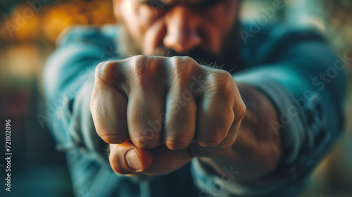 Man's clenched fist in focus, showing determination.