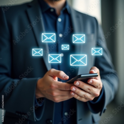 man's hand holding smartphone and check email online on the application web have envelope icons floating on the mobile screen. notification newsletter, received or sending email marketing concept
