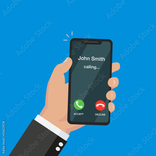 Man's hand holding smartphone with incoming call and finger touch screen. Receiving phone call concept. flat cartoon illustration for web banners, sites, infographics design.