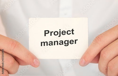 Man's hands take a card with words project manager, finance and business concept.