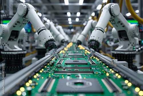 Manufacturing Automation Advanced High Precision Robot Arms on Automated PCB Assembly Line Inside Modern Electronics Factory Electronic Devices Production Industry Component Instal