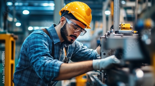 Manufacturing engineer inspects machinery and reviews production processes in an industrial environment
