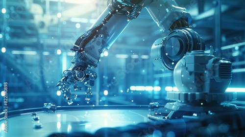 Manufacturing production line with 3D hydraulic manipulator. Futuristic background with robot arm. Automation technology in industry.
