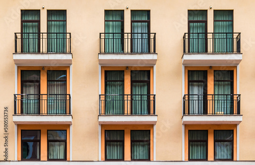Many balconies and windows in a row on the facade of the modern urban apartment building front view, Krasnaya Polyana, Sochi, Krasnodar Krai, Russia