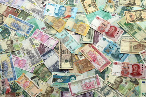 Many banknotes of different currency. Background of big amount of random money bills close up