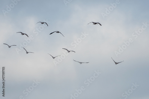 Many birds fly in the sky