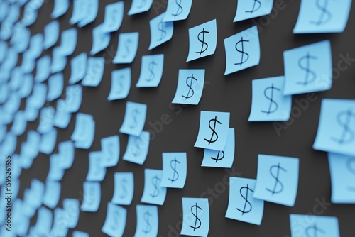 Many blue stickers on black board background with symbol of Colombia peso drawn on them. Closeup view with narrow depth of field and selective focus. 3d render, illustration