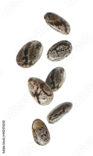 Many chia grains falling on white background, vertical banner design. Vegan diet