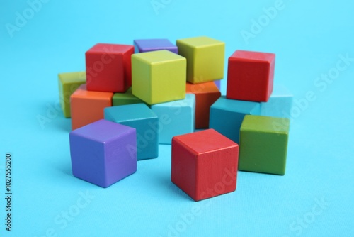 Many colorful cubes on light blue background