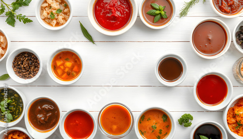Many different sauces in bowls on white wooden table, top view. Space for text isolated with white highlights, png