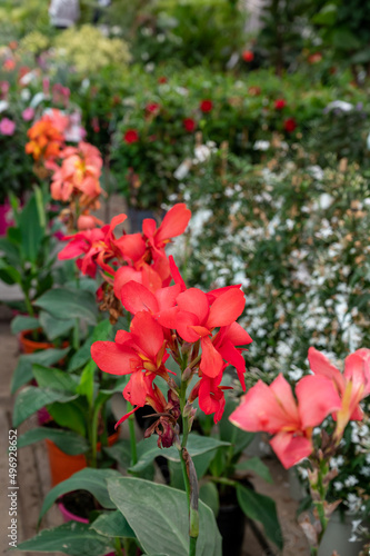 Many different tropical and exotic garden plants and colorful flowers for sale in Spanish garden shop