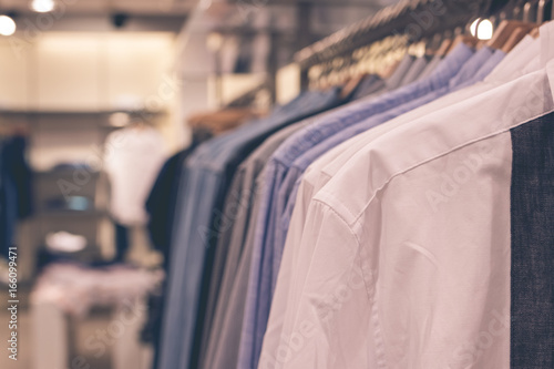 Many men shirts hanging on a rack in the shopping mall, Bali island, Indonesia.