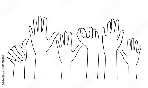 Many people's hands up isolated on white background. Various hands lifted up in the air. Line art vector Black and white .