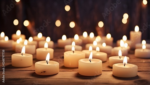 Many Small Burning Candles on Wooden Surface, Warm and Serene Atmosphere with Soft Glowing Lights.