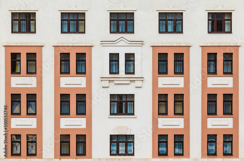 Many windows in a row on the facade of the modern urban apartment building front view, Krasnaya Polyana, Sochi, Krasnodar Krai, Russia