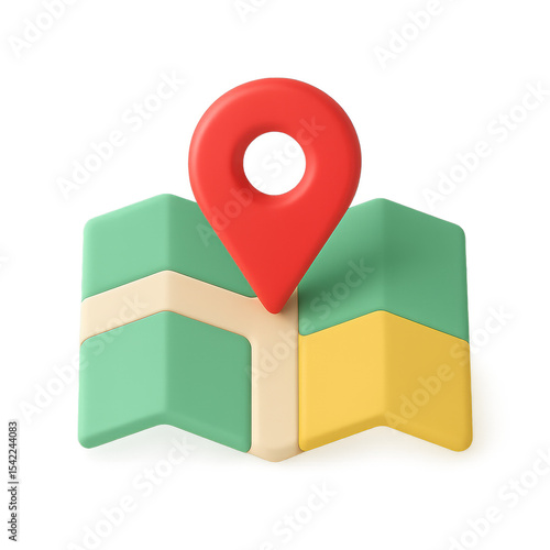 Map Location: A vibrant, three-dimensional map is punctuated by a striking red pin, instantly communicating the concept of location, navigation, and exploration.