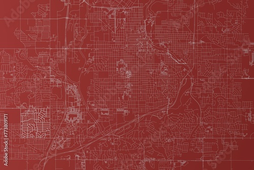 Map of the streets of Sioux Falls (South Dakota, USA) made with white lines on red background. Top view. 3d render, illustration