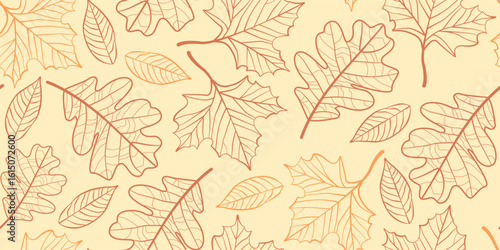 Maple and Oak Leaves Seamless Pattern Minimalist Line Art Style. Autumn Leaves Hand Drawn Minimal Wallpaper Background Design. Season Fall Template for Poster, Banner, Web, Social Media. Vector