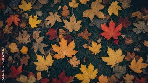 Maple leaves in red, orange, and brown create a textured autumn scene
