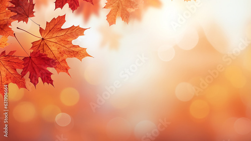 maple leaves on abstract blurred background with bokeh copy space, light bright autumn background for text