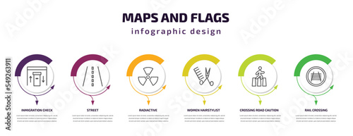 maps and flags infographic template with icons and 6 step or option. maps and flags icons such as inmigration check point, street, radiactive, women hairstylist, crossing road caution, rail crossing