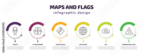 maps and flags infographic template with icons and 6 step or option. maps and flags icons such as toilets, flyover bridge, curves ahead, earth gobe, co2, narrow right lane vector. can be used for