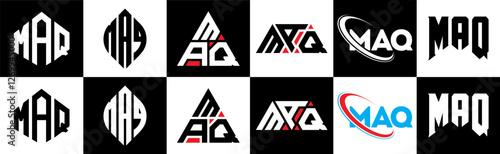 MAQ letter logo design in six style. MAQ polygon, circle, triangle, hexagon, flat and simple style with black and white color variation letter logo set in one artboard. MAQ minimalist and classic logo