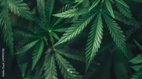 Marijuana leaves on a background, close up top view on cannabis leaves and branches on background for alternative medical and marketing design concept