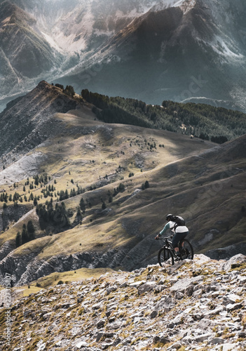 Maritime Alps - mountain biker descending from a summit with dramatic mountain backdrop in the Alps