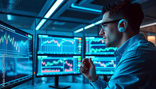 Market Analyst Monitoring Real-Time Trading Charts in a High-Tech Office