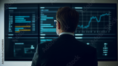 Market Analyst Reviewing Data: A businessman in a suit studies large screen displaying financial data, charts, and graphs in a darkened room. The image evokes a sense of focus.