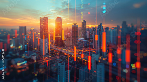 Market behavior graph hologram, sunset panoramic city view of Bangkok, popular location to achieve financial degree in Southeast Asia. The concept of financial data analysis. Double exposure.