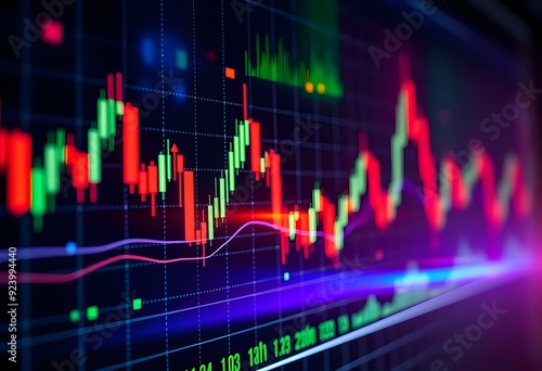 Market chart of business increase stock graph showing candlestick patterns and price movements against a dark background or investment financial data profit on growth money diagram