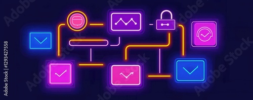 marketing automation lead customer concept. Neon digital flowchart with icons and interconnected pathways.