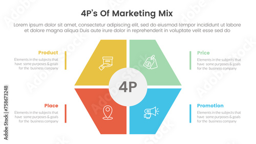 marketing mix 4ps strategy infographic with hexagon shape main center with 4 points for slide presentation