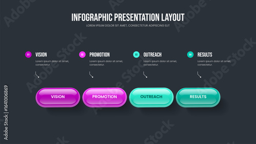 Marketing Portfolio Presentation Template Vector Illustration. Creative Showcase 4 Option Diagram Slide Design. Company Planning Four Element Infographic Slideshow Layout.