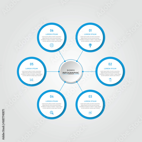 Marketing process visualization timeline diagram | Business data representation with white circle diagram dot connection with icon | 3d centre radial 6 steps sky-blue flowchart for business