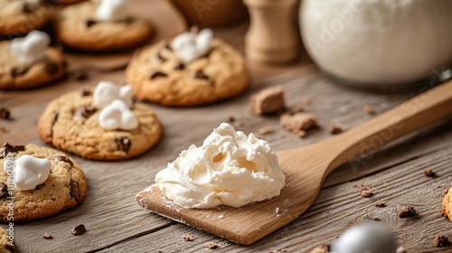 Marshmallow fluff being spread on freshly baked cookies, with a wooden spatula and a rustic kitchen counter