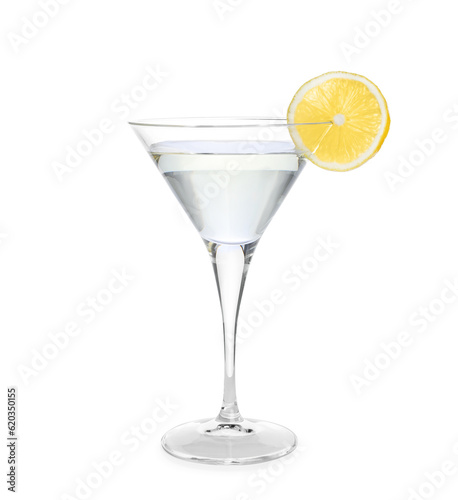 Martini glass of refreshing cocktail decorated with lemon slice isolated on white