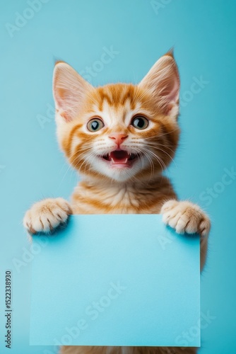 Mascot pose in studio. Сute cat japanese bobtail hold in front paws a layout - large blue drive sign. Billboard cat mockup. Cat on banner. Isolated baby cat on a solid apparel rblue backgrou.