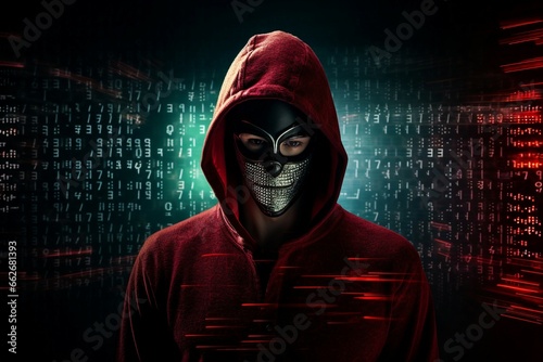 Masked Hacker: Dark Background Enhanced with Digital Code Effects